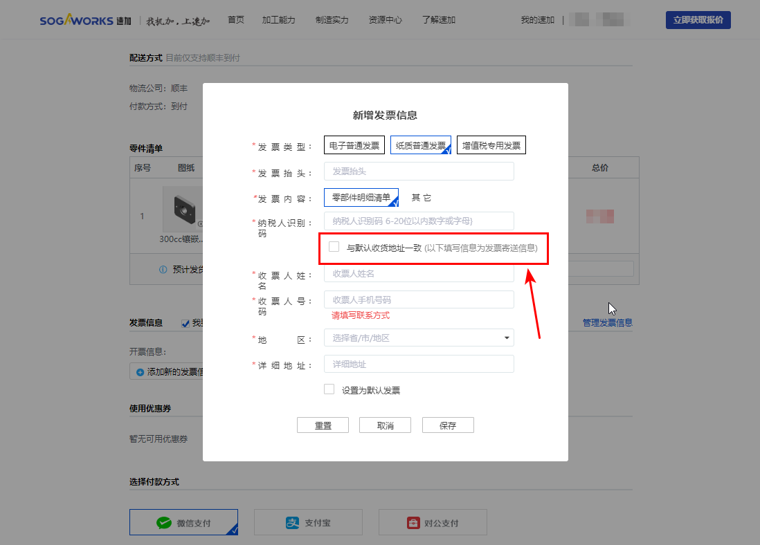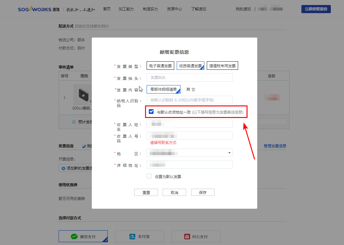 6.2.1 如您勾選【與默認(rèn)收貨地址一致】,則您的發(fā)票將會(huì)隨貨發(fā)出