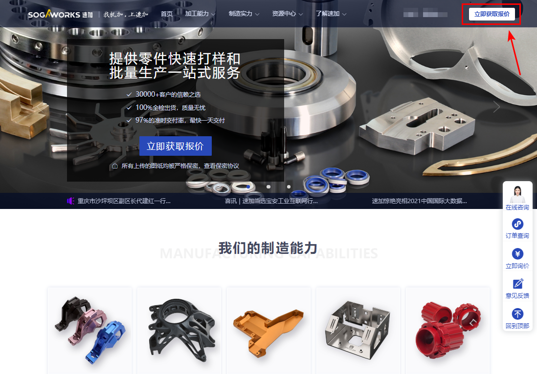 1. 在速加官網(wǎng)點(diǎn)擊【獲取報(bào)價(jià)】進(jìn)入自動(dòng)報(bào)價(jià)頁(yè)面,并上傳圖紙